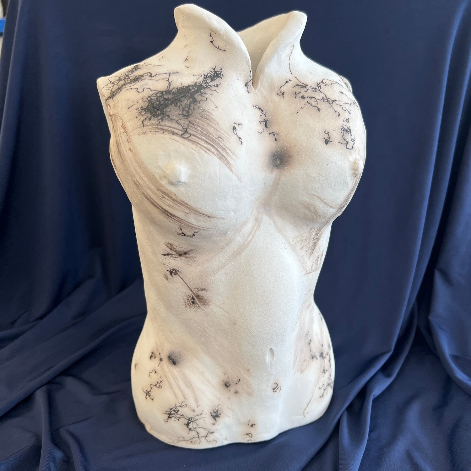 Hand sculpted and Raku fired torso with horse hair and feathers.