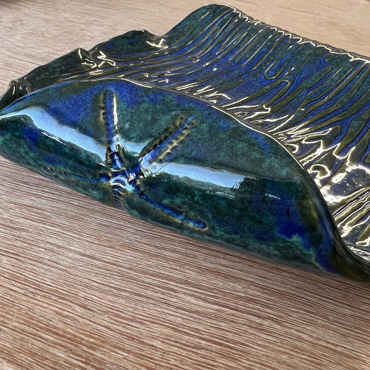Hand sculpted platter in stoneware and blue, green glaze with starfish detail.