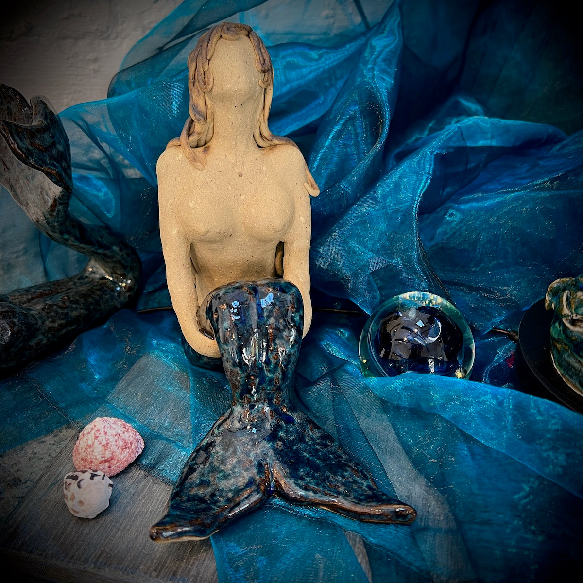 Hand sculpted mermaid in stoneware and blue, green glaze